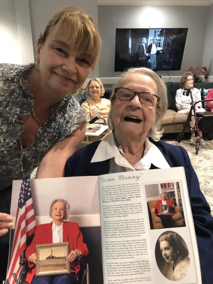 An avid news reader, Bunny was honored to be photographed and interviewed for She Served magazine. She also enjoys veterans’ events in her senior living community and visits from the Daughters of the American Revolution (DAR). They presented her with a beautiful blanket, clothes, and flowers during their last visit to Magnolia Place.